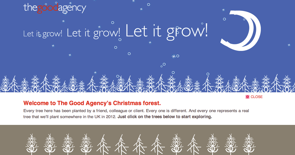 Hope your 2011 was as interesting, and 2012 turns out even more so.  To celebrate, have a look about The Good Agency Christmas forest.  Every tree here has been planted by a friend, colleague or client. Every one is different. And every one represents a real tree that we’ll plant somewhere in the UK in 2012.